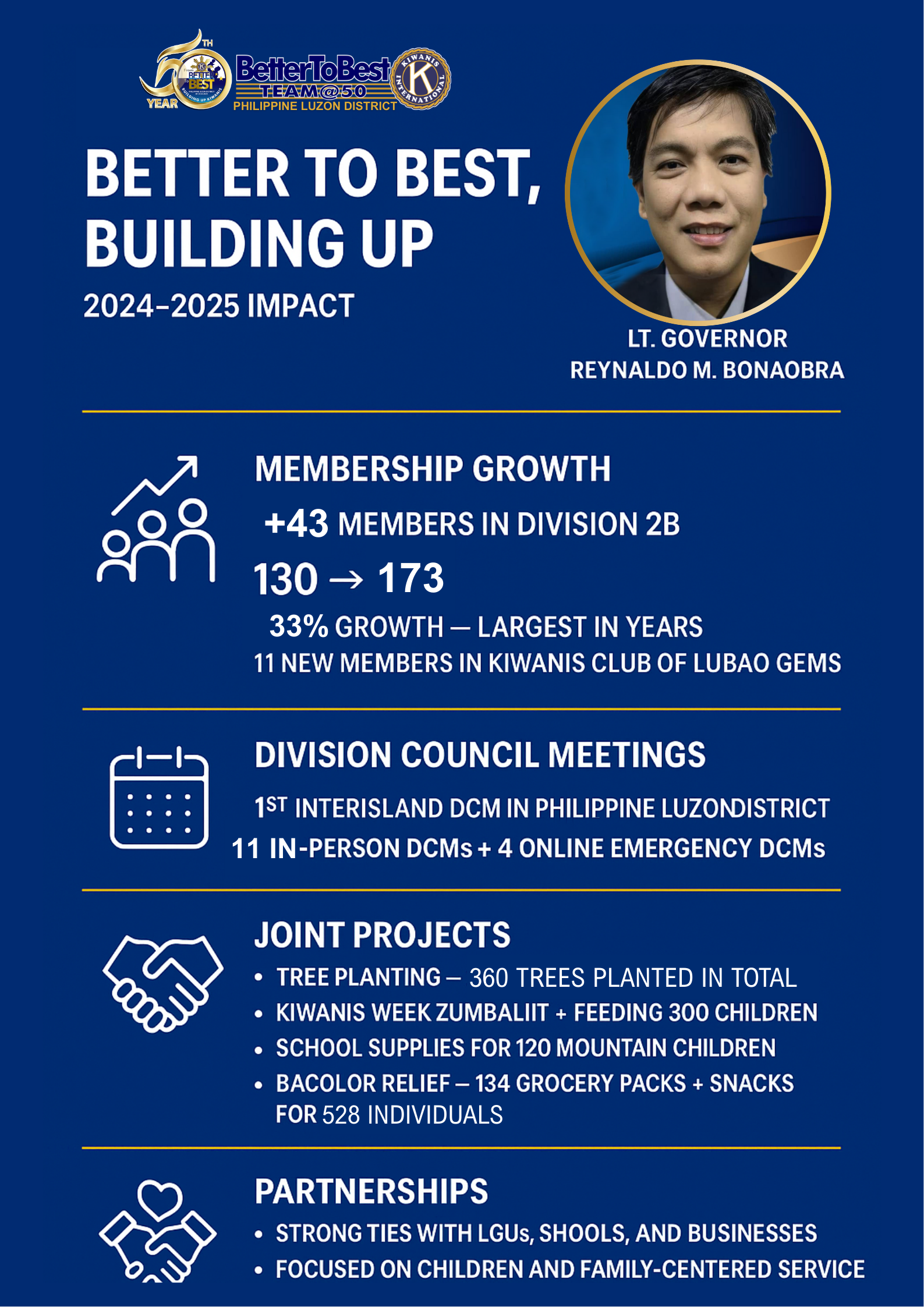 In Kiwanis, leadership is not defined by titles or accolades—it is measured by impact, unity, and the lives touched along the way. For Administrative Year 2024–2025, Lieutenant Governor Reynaldo M. Bonaobra of Kiwanis Division 2B, Philippine Luzon District turned the theme “Better to Best, Building Up” into a living, breathing reality.