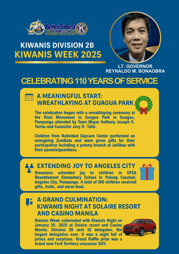 Kiwanis Division 2B, under the leadership of Lt. Governor Reynaldo M. Bonaobra, celebrated the 110th anniversary of Kiwanis International with a vibrant, week-long series of activities that showcased service, camaraderie, and the joy of giving. From January 19 to January 26, 2025, the division’s eight dedicated clubs came together for Kiwanis Week—a celebration that not only honored the organization’s rich legacy but also strengthened its mission to serve children and communities.